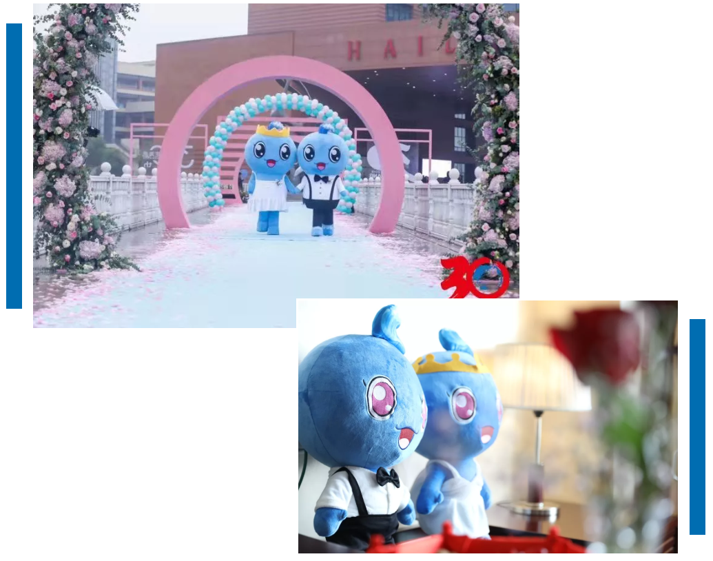 這次婚禮上有一對“萌物”,是基于海亮原來的吉祥物,特別設計的一對人偶吉祥物亮亮和靚靚。他倆也成了一對兒,陪同新人們走進愛的禮堂。