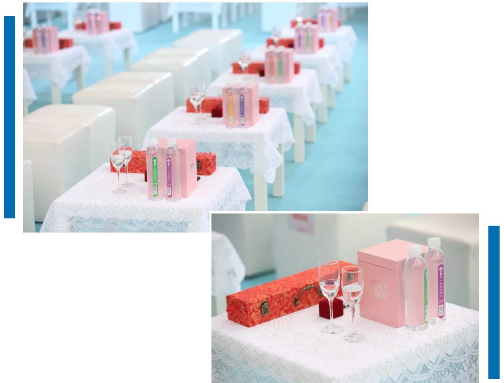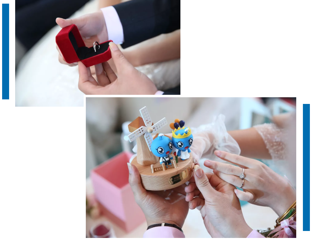 每對新人都擁有一份貼心的伴手禮,定制對戒和以“亮亮、靚靚”為主角的八音盒,每個八音盒的底座上都印著新人的名字。