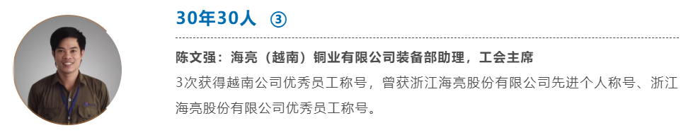 從越南前江大學畢業,加入海亮(越南)銅業有限公司后,陳文強不斷被貼上 “敬業好學”、“友好團結”、“勤勤懇懇”等標簽。十年時間里,努力學習中文,從職場“小白”蛻變成基層技術骨干,同時挑起工會主席重任,做好公司與員工溝通的“橋梁”。